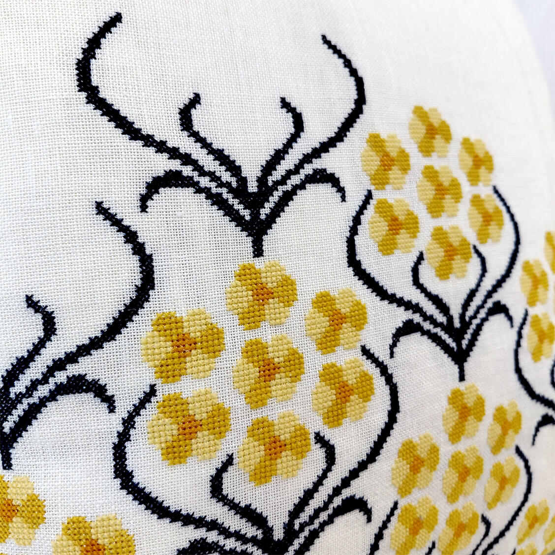 The colour palette is simple and effective. The warm yellow tones stand out clearly against the light linen ground and are emphasised by the black lines, which add contrast and depth. Embroidered in Danish Flower Thread, the surface achieves a matte, textile quality where colours remain vivid without becoming overpowering. The linen fabric from Haandarbejdets Fremme contributes a calm texture that highlights both stitches and motif.